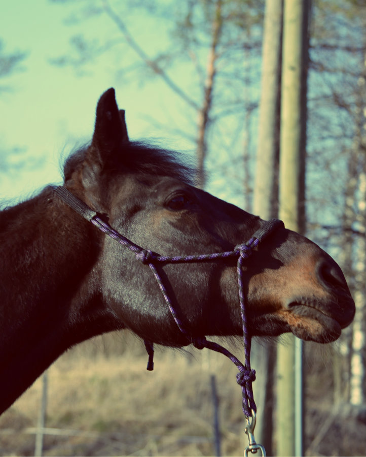 Tälle päivälle olin suunnitellut rentoa temppukoulutusta, ja koska lämmin aurinko päätti piristää päivää tänäänkin, sain houkuteltua kuvaajankin mukaan ikuistamaan hetkiä tallilta. Jimppa oli löytänyt mutalammikkojen ilot ulkoillessaan, joten meitä vastassa oli (onneksi kuivuneen) muran peitossa oleva poni. Korvat tötteröllä se kuunteli pääsiäisravien loppuhetkien ääniä, kunhan oli ensiksi laahustanut tarhan perältä portille minua vastaan.Takajalan vuohisen haavakin on parantunut mukavasti. Yhtenä päivänä se oli vähän uhannut turvotella, mutta saatuamme lainaan tallinomistajalta Terramycin-suihketta kaikki imppariin viittaavat merkit loppivat siihen. Pesin haavan pävittäin Betadinella ja suihkutin Terramycinia puhdistetun haavan päälle, ja nyt se on umpeutunut eikä vaivaa hevostakaan liikkeessä ollenkaan.