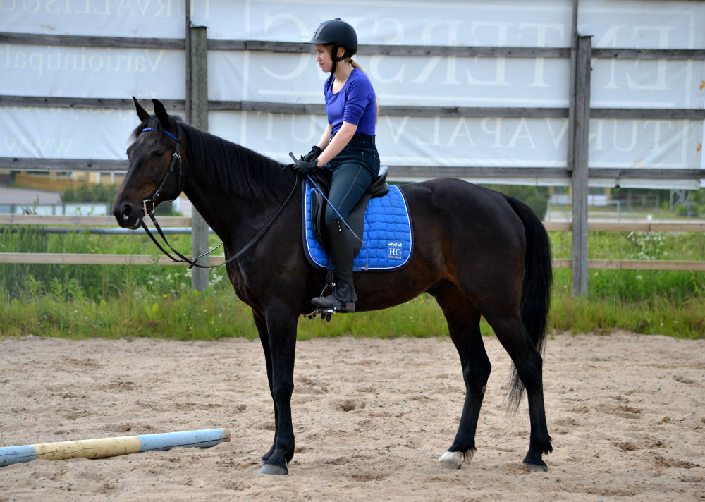 Oli sen vauhdikkuudesta jotain hyötyäkin; laukat nimittäin onnistuivat todella hyvin! En ollut tainnut harjoitella oikeaa laukkaa sitten viime valmennuksen, jos ihan oikein muistan, joten odotukset olivat hyvin matalalla sen suhteen. Emme muutenkaan olleet nyt vähään aikaan laukanneet kovinkaan paljoa, joten minulle tuli yllätyksenä, kuinka nopeasti ruuna nosti oikeankin laukan ja jatkoi sitä molempiin kierroksiin ilman jatkuvaa muistuttelua. Tällä kertaa laukan ylläpitämisessä ei ollut mitään ongelmaa, vaan sen saamisessa alas raville! :D Laukasta innostuessaan Jimppa tyrkyttää usein peitsiä ravin sijaan tai nostaa uuden laukan, ja niin se toimi eilenkin. Peitsiräpellystä ei kuitenkaan kestänyt kuin muutaman metrin, ja sitten ruuna sai jalkansa järjestykseen ja ravin alle.